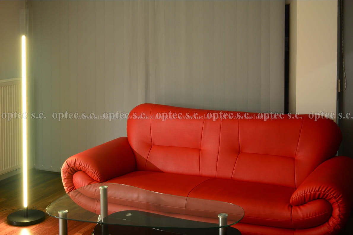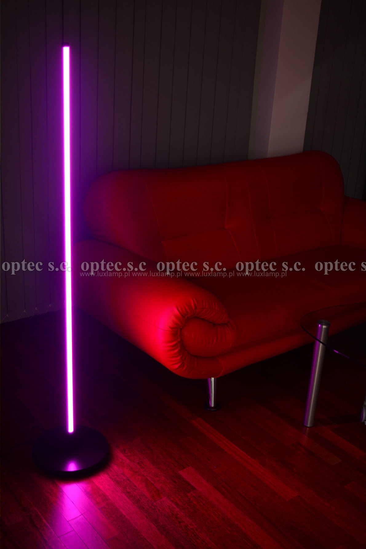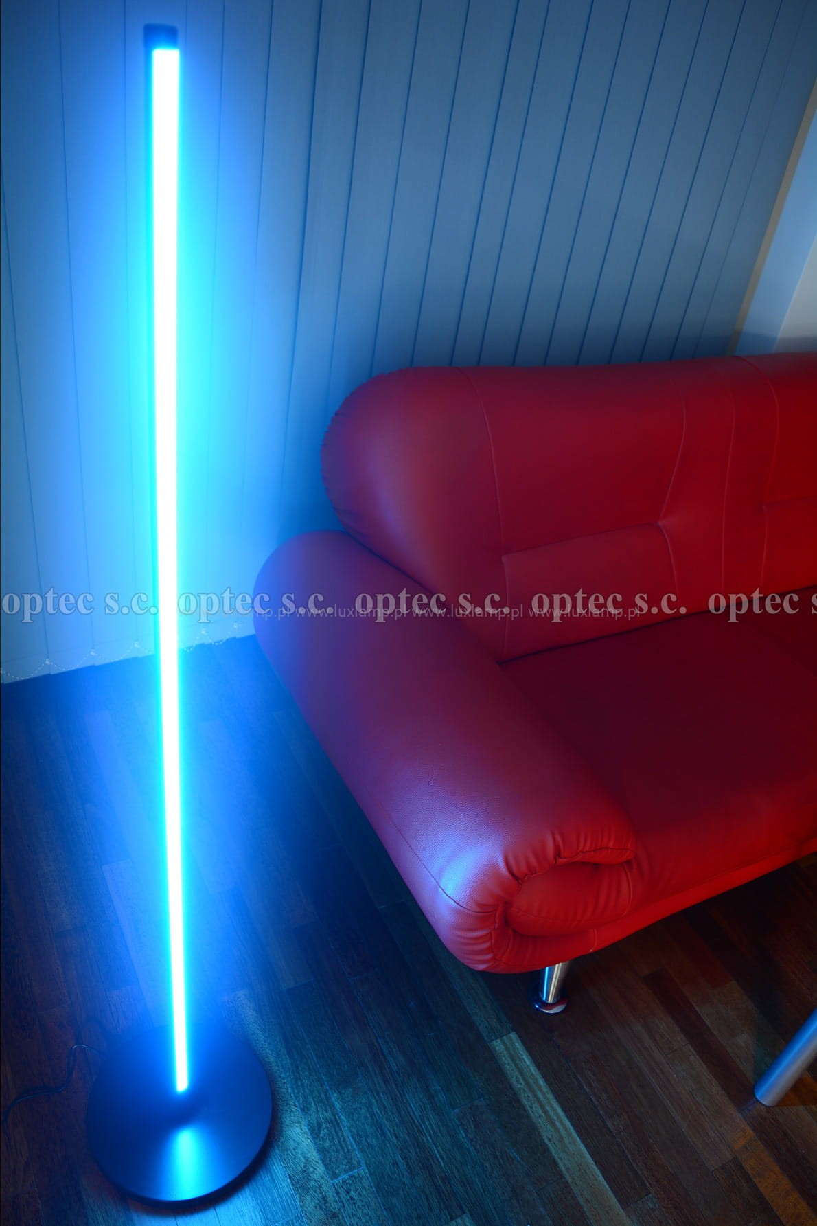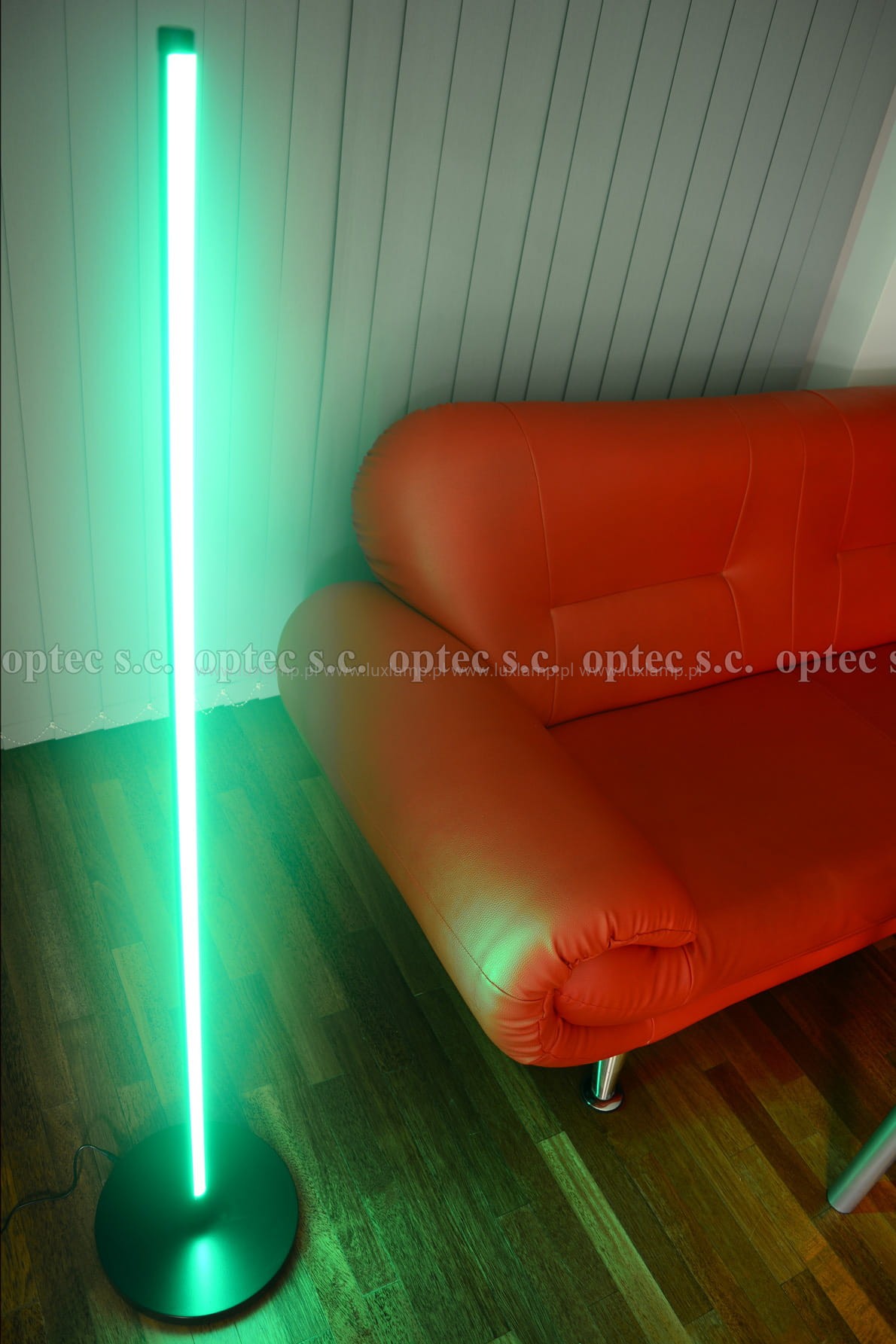 Nowoczesna lampa podłogowa LED RGBW z pilotem radiowym, lampa ma możliwość emisji koloru ciepłego białego jak i kolorów RGB. Dodatkowym atutem jest uzyskana w lampie równomierna linia światła rozproszonego kloszem mlecznym.