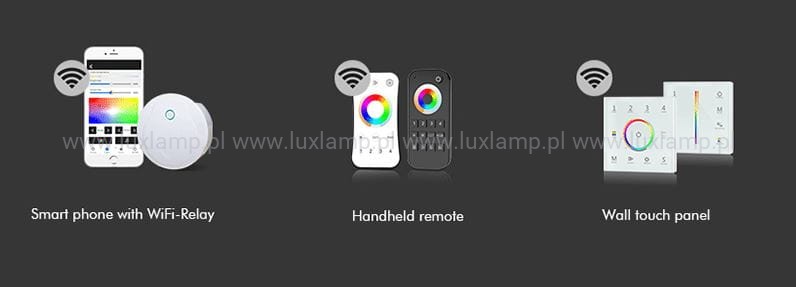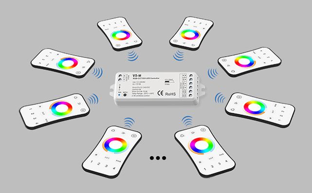 Sterownik V5-M LED RGB+CCT jest sterownikiem 4-strefowym. Możemy go stosować z pilotem RT10 do: