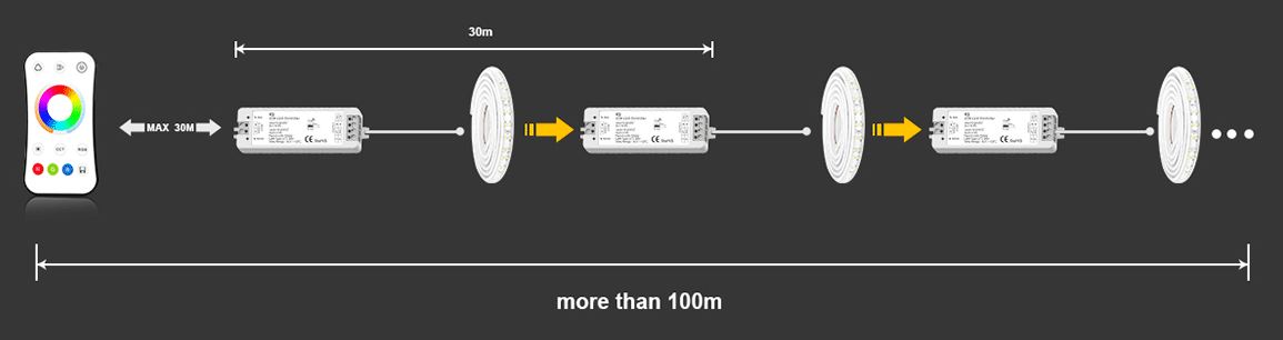 Gdy sterowniki V5-M są zaprogramowane na tej samej strefie pilota, wówczas automatycznie, równocześnie transmitują one sygnał do kolejnych sterowników V5-M (maksymalna odległość między sąsiadującymi sterownikami 30m) rozszerzając dystans miedzy pilotem a najdalej wysuniętym sterownikiem nawet do ponad 100m.